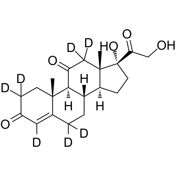 Cortisone-d7 是 Cortisone 的氘代物。Cortisone (17-Hydroxy-11-dehydrocorticosterone),是 Cortisol(一种糖皮质激素)的氧化代谢产物。Cortisone 具有免疫抑制和消炎的作用。Cortisone 在高浓度下可以部分干预 Glucocorticoid 与 Glucocorticoid-receptor 的结合。