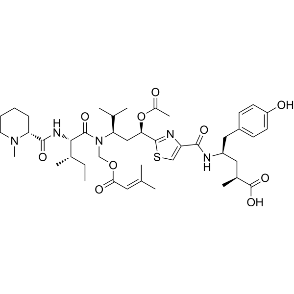 Tubulysin G 是具有高细胞毒性的抗微管毒素 (anti-microtubule toxins),作为 ADC 细胞毒素 (ADC Cytotoxin) 合成 ADC。Tubulysin G 能够从粘细菌 Archangium geophyra 和 Angiococcus disciformis 中分离得到。Tubulysin G 在哺乳动物细胞中显示出极其有效的细胞毒活性,包括多药耐药细胞系,IC50 值在较低的纳摩尔范围内。Tubulysin G 可抑制微管蛋白 (Microtubule/Tubulin) 聚合并导致细胞周期停滞和凋亡 (apoptosis)。
