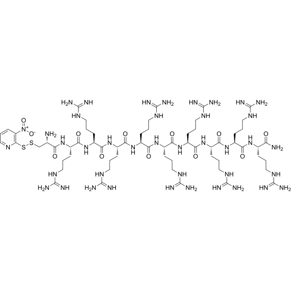 Cys(Npys)-(Arg)9 是一种细胞穿透肽。Cys(Npys)-(Arg)9 是由 9 个 D-精氨酸残基和一个活化的半胱氨酸残基 C(Npys) 组成。Cys(Npys)-(Arg)9 可作为载体肽,可用于偶联和细胞通透性的研究。