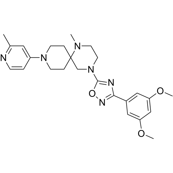 MRK-740 是一种有效的,选择性的,与底物竞争的 PRDM9 组蛋白甲基转移酶抑制剂,IC50 为 80 nM。MRK-740 对 PRDM9 的选择性高于其他组蛋白甲基转移酶和其他非表观遗传靶标。MRK-740 减少 PRDM9 依赖性的 H3K4 三甲基化 (IC50 为 0.8 μM)。