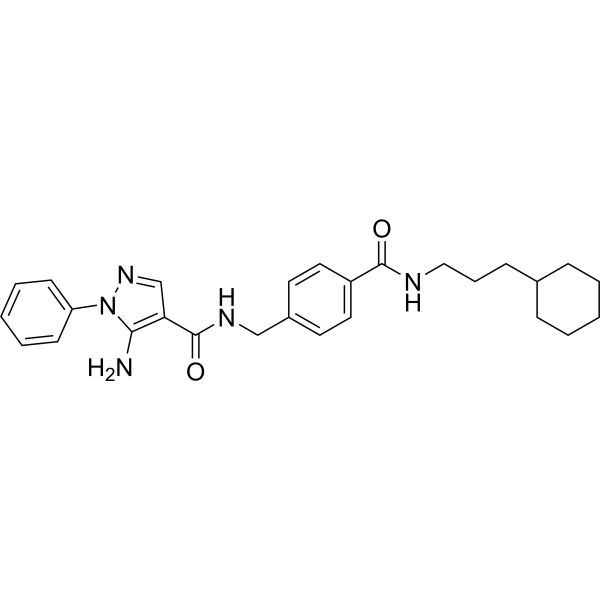SR-318 是一种有效且高度选择性的 p38 MAPK抑制剂,对 p38α,p38β 和 p38α/β 的 IC50 分别为 5 nM,32 nM 和 6.11 μM。SR-318 有效抑制全血中 TNF-α 的释放,IC50 为 283 nM。SR-318 具有抗癌和抗炎活性。