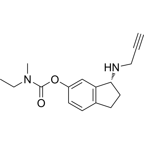 Ladostigil (TV-3326) 是一种口服有效的胆碱酯酶 (cholinesterase) 和脑选择性单胺氧化酶 (MAO) 的双重抑制剂,抑制 MAO-B 和 AChE 的 IC50 值分别为 37.1 和 31.8 μM。Ladostigil 具有神经保护,抗氧化和抗炎的作用,可用于抑郁症和阿尔茨海默症的研究。Ladostigil 是一种点击化学试剂。它含有 Alkyne 基团,可以和含有 Azide 基团的分子发生铜催化的叠氮-炔环加成反应 (CuAAc)。