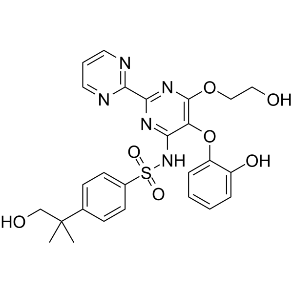 Hydroxy desmethyl Bosentan (Ro 64-105) 是一种 Bosentan 代谢物。在肝脏中由细胞色素 P450 酶 CYP2C9 和 CYP3A4 催化产生的。Bosentan 是一种有效的 endothelin-1 (ET) 拮抗剂,在人的 SMC 细胞中,作用于 ETA 和 ETB 受体,Ki 值分别为 4.7 nM 和 95 nM。Bosentan 可用于研究肺动脉高压。