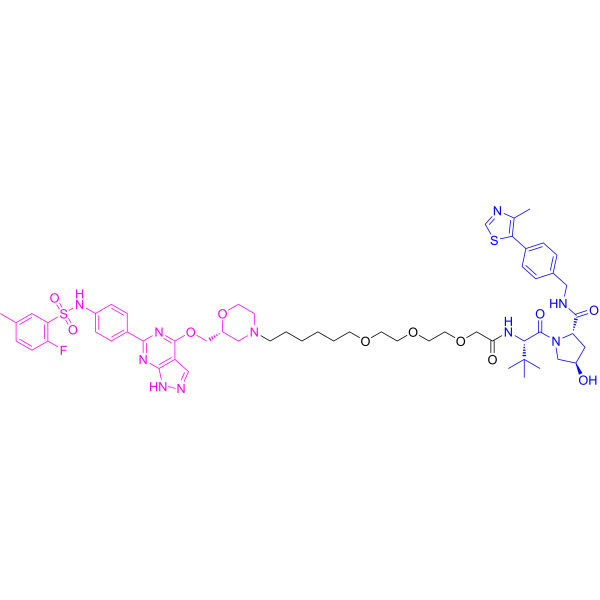 PROTAC SGK3 degrader-1 (SGK3-PROTAC1) 是一种基于 von Hippel-Lindau 配体的 SKG3 降解剂。PROTAC SGK3 degrader-1 (0.3 μM) 在 2 小时内诱导 50% 内源性 SGK3 降解,8 小时观察到 80%SGK3 的降解,并伴随着 NDRG1 (SGK3 底物) 的磷酸化损失。