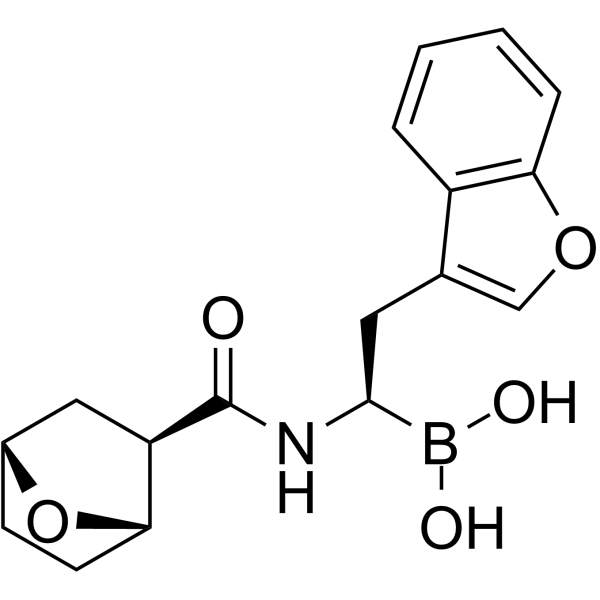 M3258 是一种口服生物利用度高、有效、可逆、高选择性的免疫蛋白酶体亚单位 LMP7 (β5i) 抑制剂。M3258 对 LMP7 的 IC50 为 3.6 nM,在细胞中 IC50 为 3.4 nM。M3258 在多发性骨髓瘤异种移植模型中显示出很强的抗肿瘤作用。在多发性骨髓瘤细胞中,M3258 导致肿瘤 LMP7 活性和泛素化蛋白转换的显著且持久的抑制以及诱导凋亡 (apoptosis)。