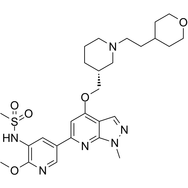 Siramesine (Lu 28-179) hydrochloride 是一种有效的 sigma-2 受体激动剂。Siramesine 对 sigma-2 受体具有亚纳摩尔亲和力 (IC50=0.12?nM),并且对 sigma-2 受体的选择性是 sigma-1 受体的 140 倍 (IC50=17?nM)。Siramesine hydrochloride 通过线粒体的不稳定而不是溶酶体触发细胞死亡。Siramesine hydrochloride 显示出强大的抗癌活性。