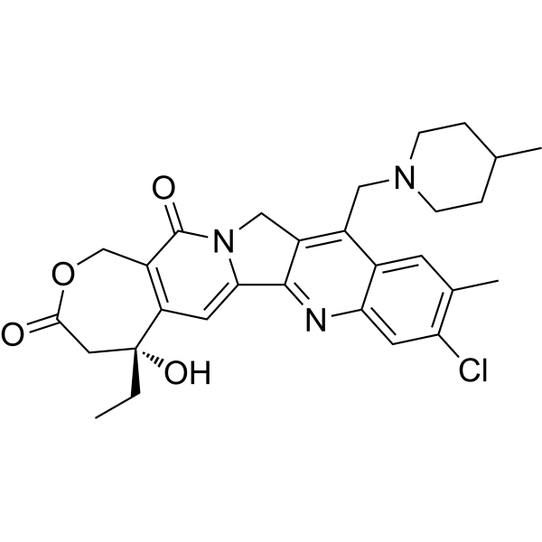Elomotecan (BN 80927 free base) 是一种有效的拓扑异构酶 I (topoisomerases I) 和 II 抑制剂。Elomotecan 是属于高喜树碱家族 (hCPT) 的喜树碱类似物。与其他拓扑异构酶 I 和 II 的参考抗癌活性分子相比,Elomotecan 减少不同肿瘤细胞的增殖效果更好。