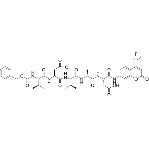 Z-VDVAD-AFC 是一种荧光底物。Z-VDVAD-AFC用于测定半胱氨酸蛋白酶3 (Caspase-3) 的活性。Z-VDVAD-AFC 发生水解,释放 7-氨基-4-三氟甲基香豆素 (AFC)。AFC 在紫外光照射下呈荧光,能发出荧光信号。