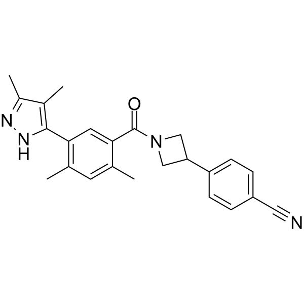 TVB-3664 是具有口服活性的、可逆的、有效的、选择性的并具有高生物利用度的脂肪酸合酶 (FASN) 抑制剂,其对人和老鼠棕榈酸酯合成的 IC50 值分别为 18 nM 和 12 nM。可显著降低微管蛋白棕榈酰化和 mRNA表达。