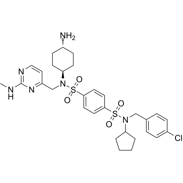 Dot1L-IN-1 是一种高效的选择性 Dot1L 抑制剂,Ki 为 2 pM,IC50<0.1 nM。Dot1L-IN-1 有效抑制 HeLa 细胞中 H3K79 二甲基化 (IC50=3 nM) 以及 Molm-13 细胞中 HoxA9 启动子的活性 (IC50=17 nM)。