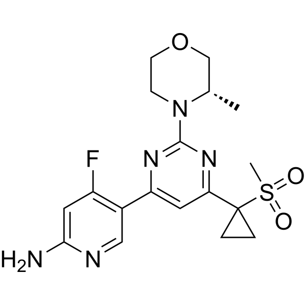 PI3K/mTOR Inhibitor-1 是一种有效的,口服生物可利用的双重 PI3K/mTOR 抑制剂,抑制 PI3Kα/PI3Kβ/PI3Kγ/PI3Kδ 和 mTOR,IC50 分别为 20/376/204/46 nM 和 186 nM。具有抗肿瘤活性。