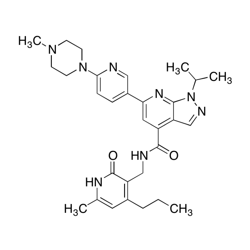 WRG-28 是一种选择性的、细胞外作用的 DDR2 变构抑制剂,其 IC50 值为 230 nM。WRG-28 抑制肿瘤侵袭,迁移和 CAFs 的促肿瘤作用,还能抑制转移性乳腺肿瘤细胞在肺部的定植。WRG-28 也在 CAIA 小鼠模型中具有较好的缓解类风湿性关节炎活性。