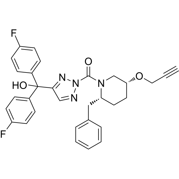 DH-376 是一种有效的甘油二酯脂肪酶抑制剂,对 ABHD6 和 DAGLα 的 pIC50 值分别为 8.6 和 8.9。DH-376 可防止禁食诱导的小鼠重新进食。DH-376 是一种点击化学试剂。它含有 Alkyne 基团,可以和含有 Azide 基团的分子发生铜催化的叠氮-炔环加成反应 (CuAAc)。