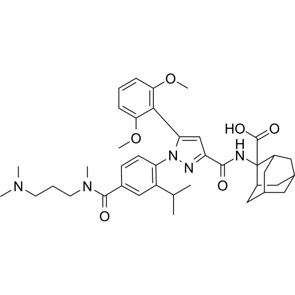 SR 142948 是一种具有口服活性、选择性的非肽神经降压素受体 (NT) 拮抗剂,在 h-NTR1-CHO 细胞、HT-29 细胞和成年大鼠脑中的 IC50 分别为 1.19 nM、0.32 nM、3.96 nM。SR 142948 在 HT-29 细胞中拮抗 NT 诱导的肌醇单磷酸盐形成,IC50 为 3.9 nM。SR 142948 在体内阻断 NT 诱导的体温过低、镇痛和转向行为。SR 142948 可以透过血脑通透性,可用于精神疾病的研究。