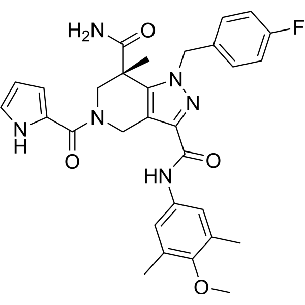Zimlovisertib (PF-06650833) 是一种有效的,选择性的和口服可生物利用的白介素-1 受体相关激酶 4 (IRAK4) 的抑制剂,其 IC50 值为 0.2 nM,在 PBMC 分析中,IC50 值为 2.4 nM。Zimlovisertib 有潜力用于类风湿性关节炎,狼疮和淋巴瘤等疾病的研究。