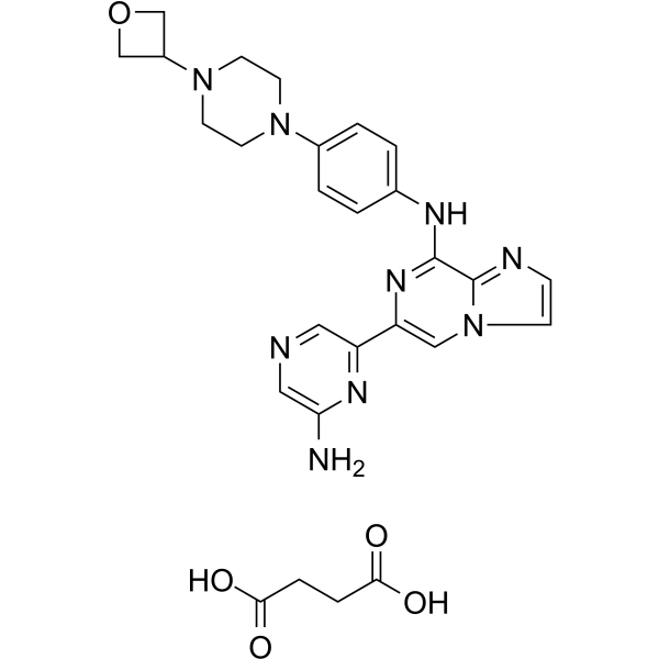 Lanraplenib succinate (GS-9876 succinate) 是一种高度选择性的口服 SYK 抑制剂 (IC50=9.5 nM) ,用于研究炎症性疾病。Lanraplenib succinate 通过糖蛋白 VI (GPVI) 受体抑制血小板中的 SYK 活性,而不会延长猴子或人类的出血时间 (BT)。