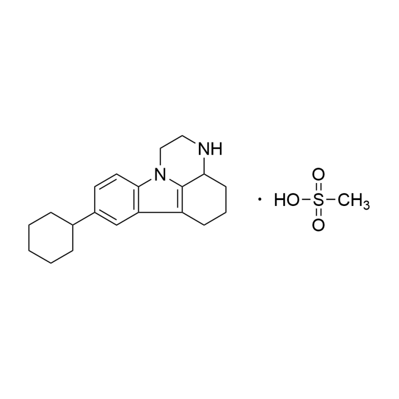 Tetrindole mesylate 是单胺氧化酶 A (MAO A) 的选择性抑制剂。Tetrindole mesylate 以竞争性方式抑制大鼠脑线粒体 MAO A,Ki 值为 0.4 μM,抑制 MAO B 的 Ki 为 110 μM。Tetrindole mesylate 具有抗抑郁活性。
