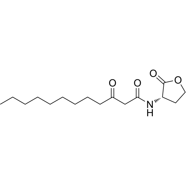 N-3-oxo-dodecanoyl-L-Homoserine lactone (3-oxo-C12-HSL) 是一种细菌群体感应信号分子,由铜绿假单胞菌和洋葱状芽孢杆菌复合物菌株产生。群体感应是细菌用来控制基因表达以响应细胞密度增加的调节系统。N-3-oxo-dodecanoyl-L-Homoserine lactone诱导 16HBE 人支气管上皮细胞产生 IL-8。
